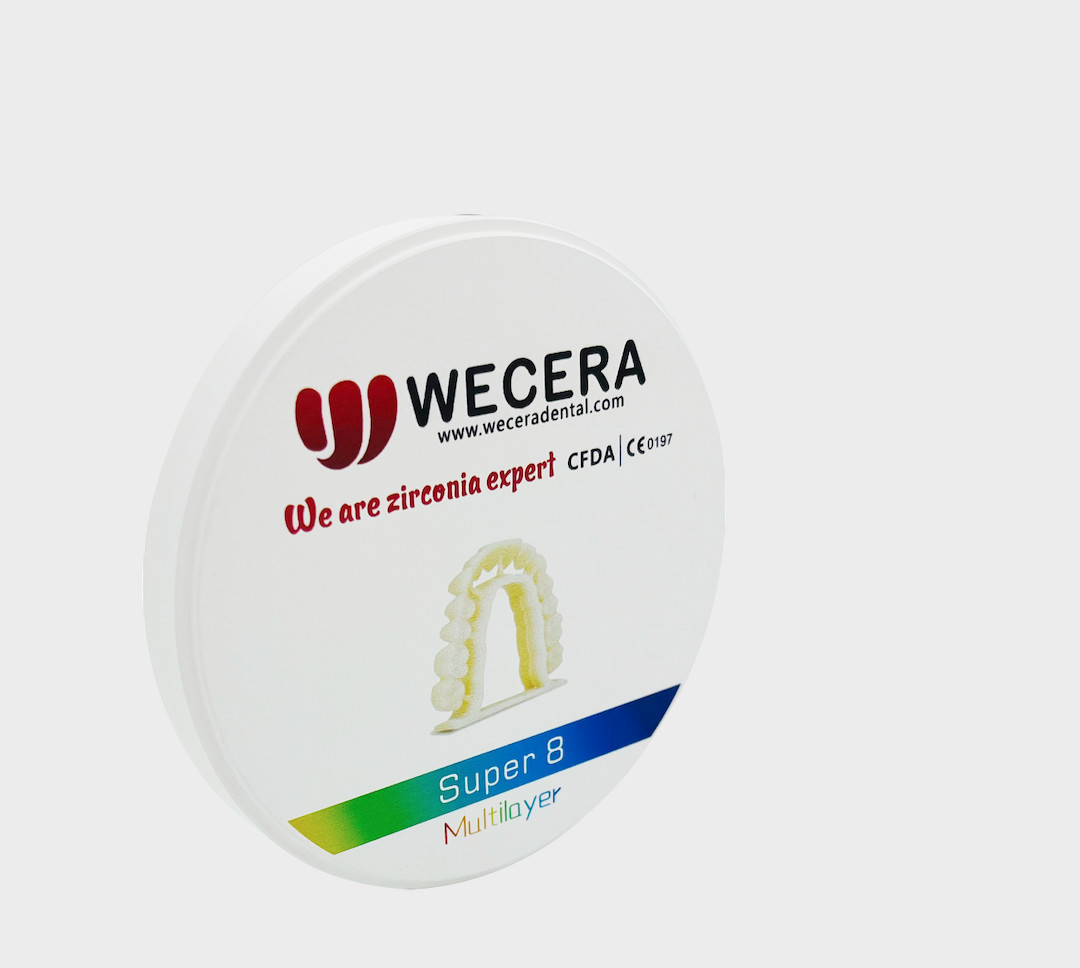 8 camadas de zircônio multicamadas, com mais camadas, a aparência parece perfeita.Este material de zircônio permite criar uma ponte de até 14 unidades sem qualquer deformação após o processo de sinterização.